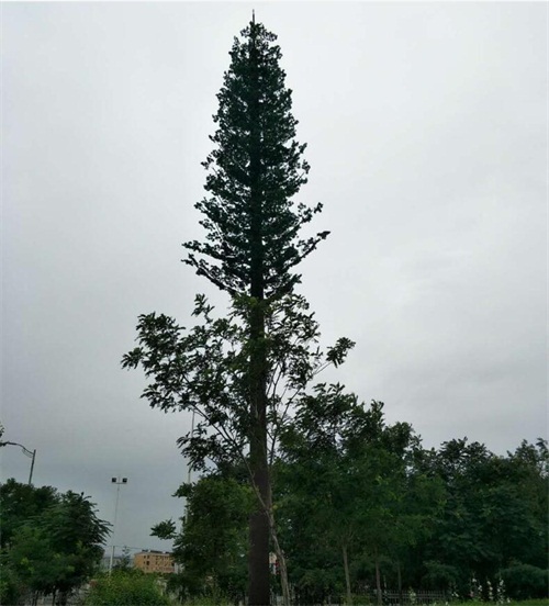 仿生树通讯塔是通信行业用于伪装天线最常用树型之一,高10米~35米。树冠整体造型成宝塔状。 仿生树通讯塔采用高强度的镀锌管塔为主杆,外敷高分子仿真树皮,透波性率强,阻燃性好,达到I级阻燃指标,保证20年不老化。树叶采用抗紫外线PU高性能防阻燃环保材料。耐腐蚀性能好,耐老化耐高温防阻燃,更加环保,防紫外线强。整体外形不仅美观,仿真度高、经久耐用,而且与周边环境特别协调,非常适用于对环境美化要求较高的基站如:高级住宅区、主题公园、风景名胜旅游区、动植物保护区及游乐场所。